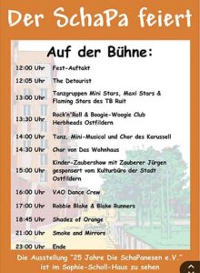 Besonderer Anlass in diesem Jahr: Das Stadtteilfest findet im Rahmen der Feierlichkeiten zu „50 Jahre Ostfildern“ statt. Gleichzeitig feiert der Bürgerverein Die SchaPanesen e.V. sein 25-jähriges Bestehen. Deshalb gibt es im Sophie-Scholl-Haus eine Ausstellung zur Geschichte und Entwicklung des Vereins, die spannende Einblicke in 25 Jahre Engagement für den Scharnhauser Park bietet.
