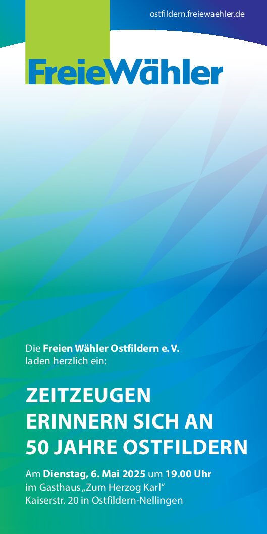 Gasthaus Zum Herzog Karl Kaiserstrasse 20, OstfildernEinlass ab 18 Uhr mit Bewirtung im Herzog Karl bei Gerhard Ebinger, Kaiserstr. 20, Nellingen. Stadtarchivar Jochen Bender und unsere Zeitzeugen geben einen einmaligen Einblick in diese wahrlich historische Leistung: Vier eigenständige Gemeinden werden zu einer Gesamtstadt zusammengeführt. Wie war damals die politische Stimmung, welche Widerstände gab es …? Unsere Gäste bringen ihre kostbaren Erinnerungen